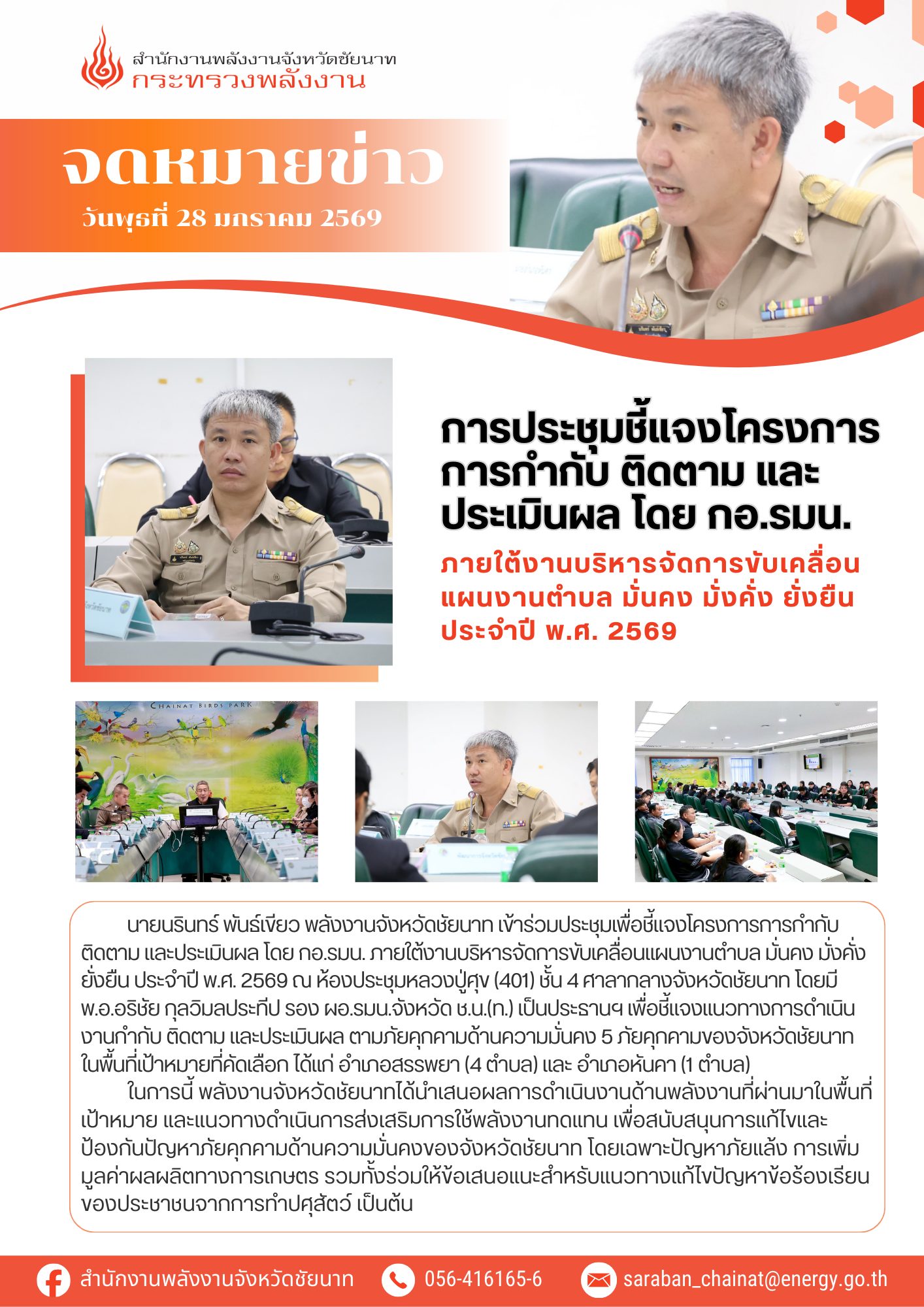 (10 พฤศจิกายน 2563) นายสมศักดิ์ วิหครัตน์ นายช่างเทคนิคอาวุโส รักษาราชการแทน พลังงานจังหวัดชัยนาท พร้อมด้วยข้าราชการและเจ้าหน้าที่ จัดสัมมนาเชิงปฏิบัติการพลังงานเรื่องใกล้ตัว ตามโครงการเพิ่มสมรรถนะด้านการบริหารและจัดการพลังงานครบวงจรในชุมชนระดับตำบล และเครือข่ายพลังงานชุมชน ประจำปี 2564 อปท.บริหารจัดการพลังงานที่ดี ณ องค์การบริหารส่วนตำบลไร่พัฒนา อำเภอมโนรมย์ จังหวัดชัยนาท